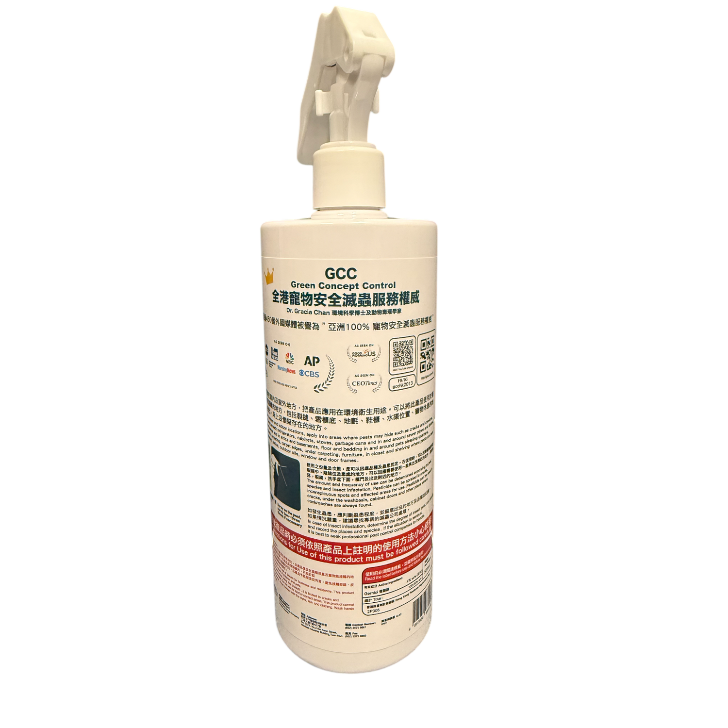 100% pet-safe, this unique all-natural pet-safe pesticide was developed by Dr. Gracia Chan and manufactured in Canada. Because it contains natural ingredients, without any unidentified chemical ingredients, it is exempt from Hong Kong government registration, and pets do not need to leave the site during the pest control period.