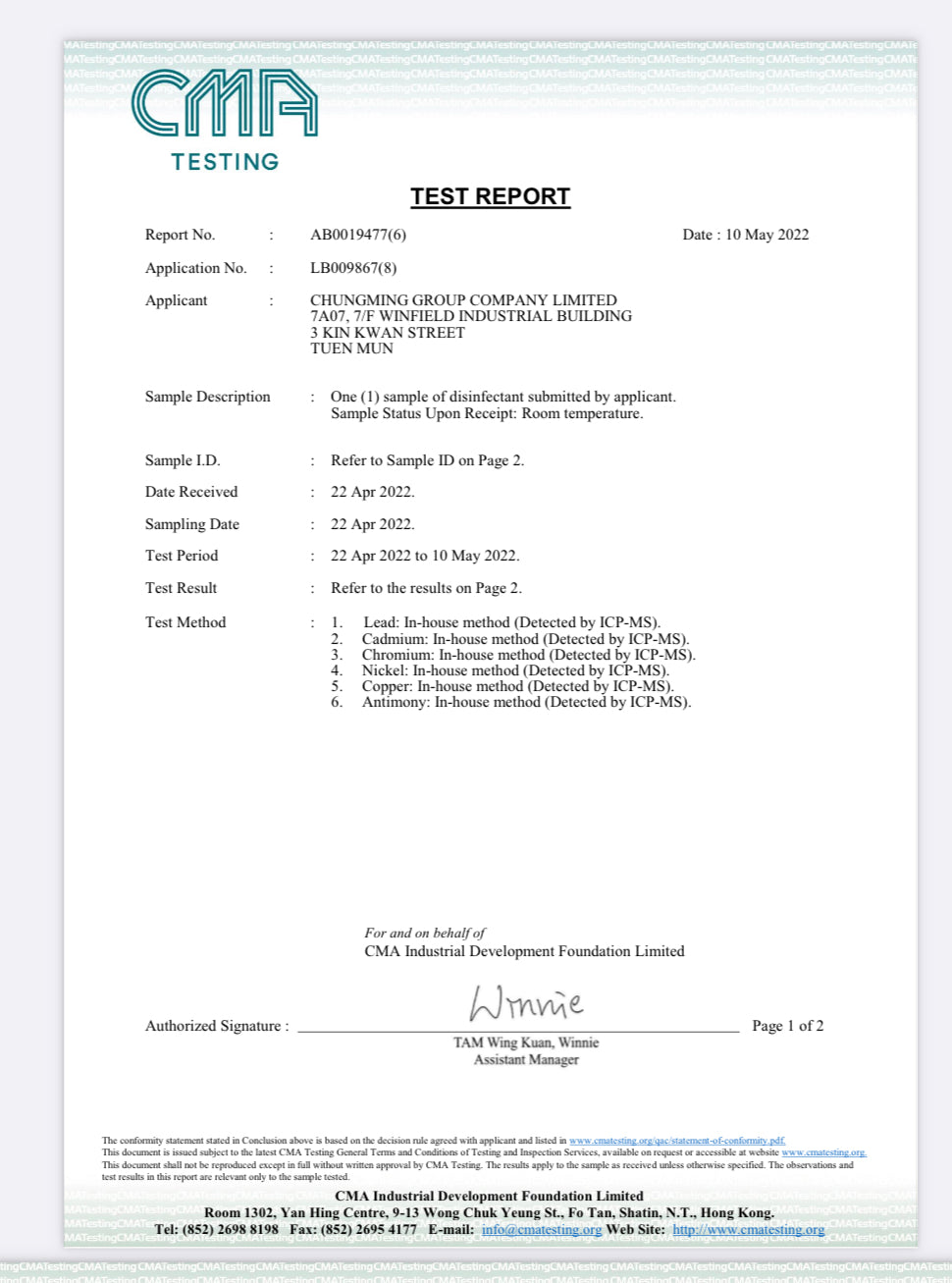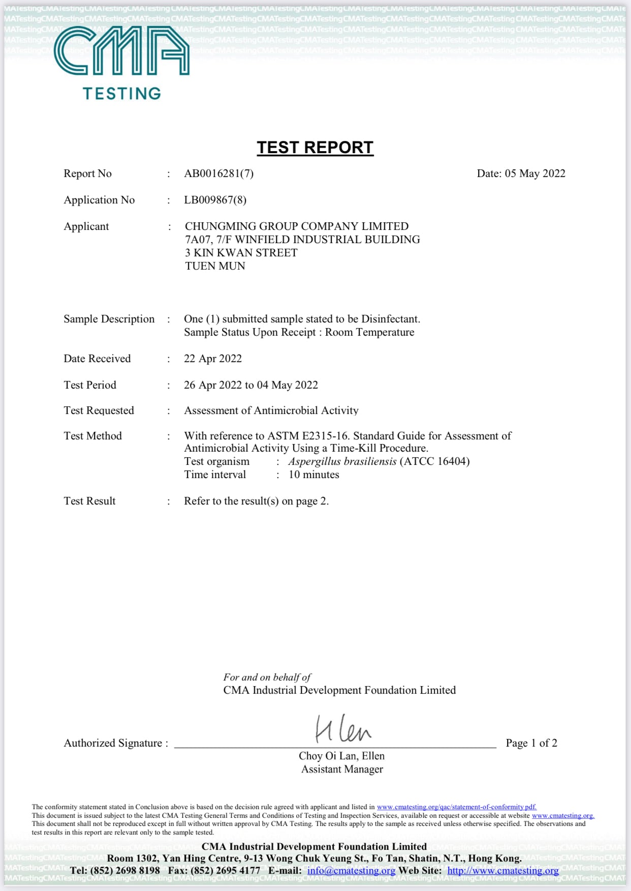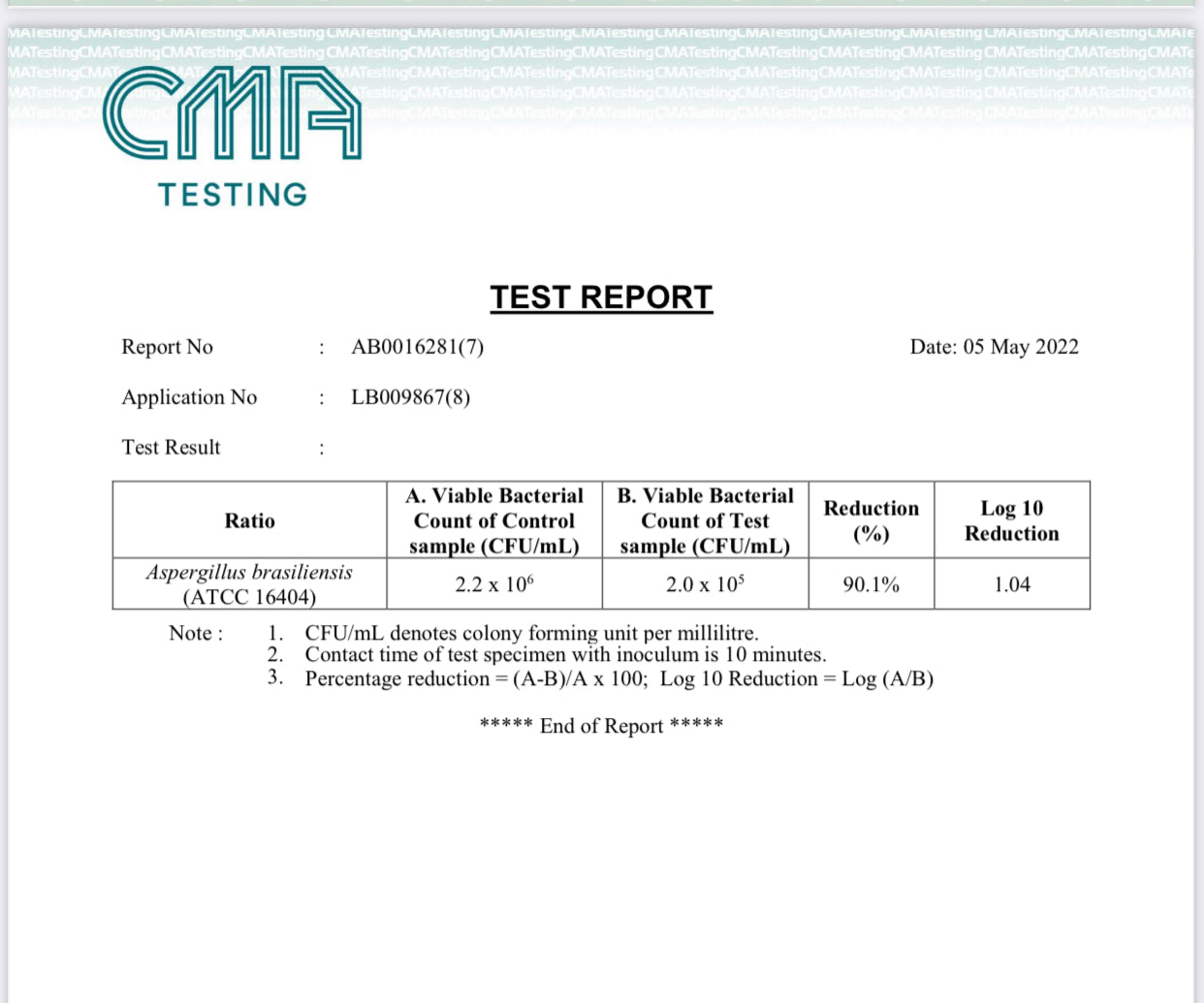 • The product passed the safety and sterilization test of the Hong Kong CMA Testing Center